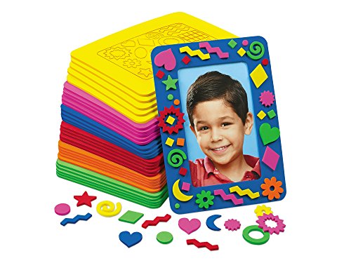 Easy-to-use, no-mess collage frames...plus all the shapes to decorate them! Our complete arts & crafts project kit includes 30 blank foam frames and 900 vibrant pop-out shapes--all with adhesive backing. Kids just stick the shapes right onto the frames...then stick on their favorite photos! Frames are 5" x 7".